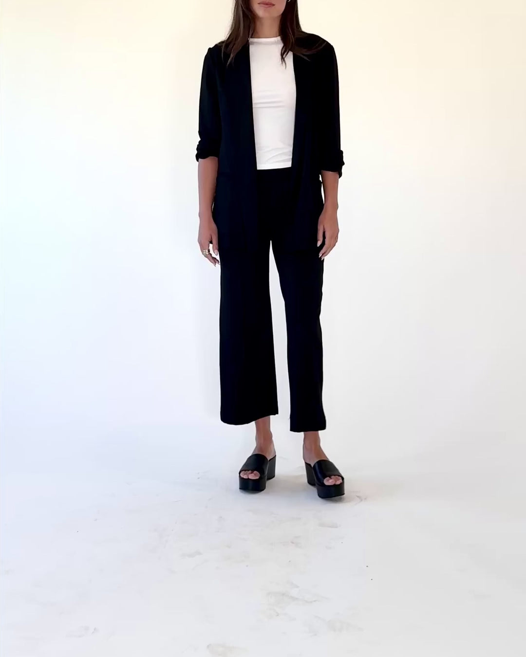 Finished with self-lined lapels, dropped shoulders, and deep pockets, it layers seamlessly over everything from wide-leg pants to denim. Travel-ready and endlessly versatile, it’s the blazer that looks polished without trying too hard.